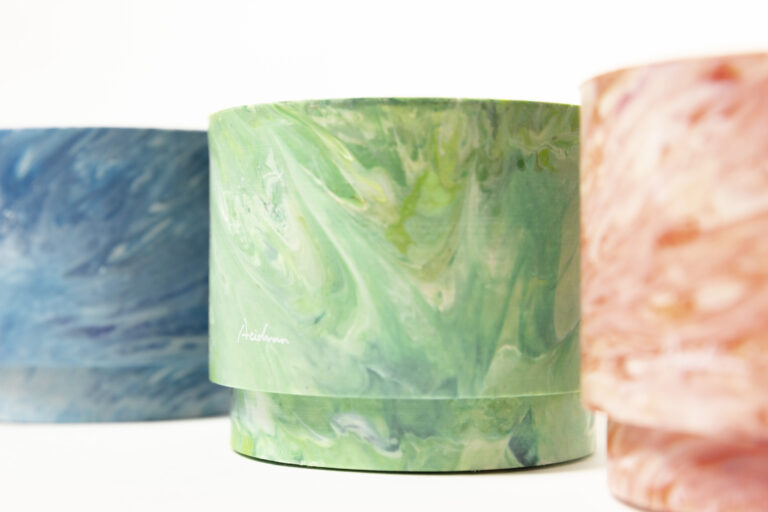 color : red , blue , green ペットボトルキャップなどの廃棄プラスチックだけを原材料とした100%再生プラスチックのフラワーポッドを作成。 ※硬質プラスチックのため、熱した金属などを直に置くと変形する可能性があります。