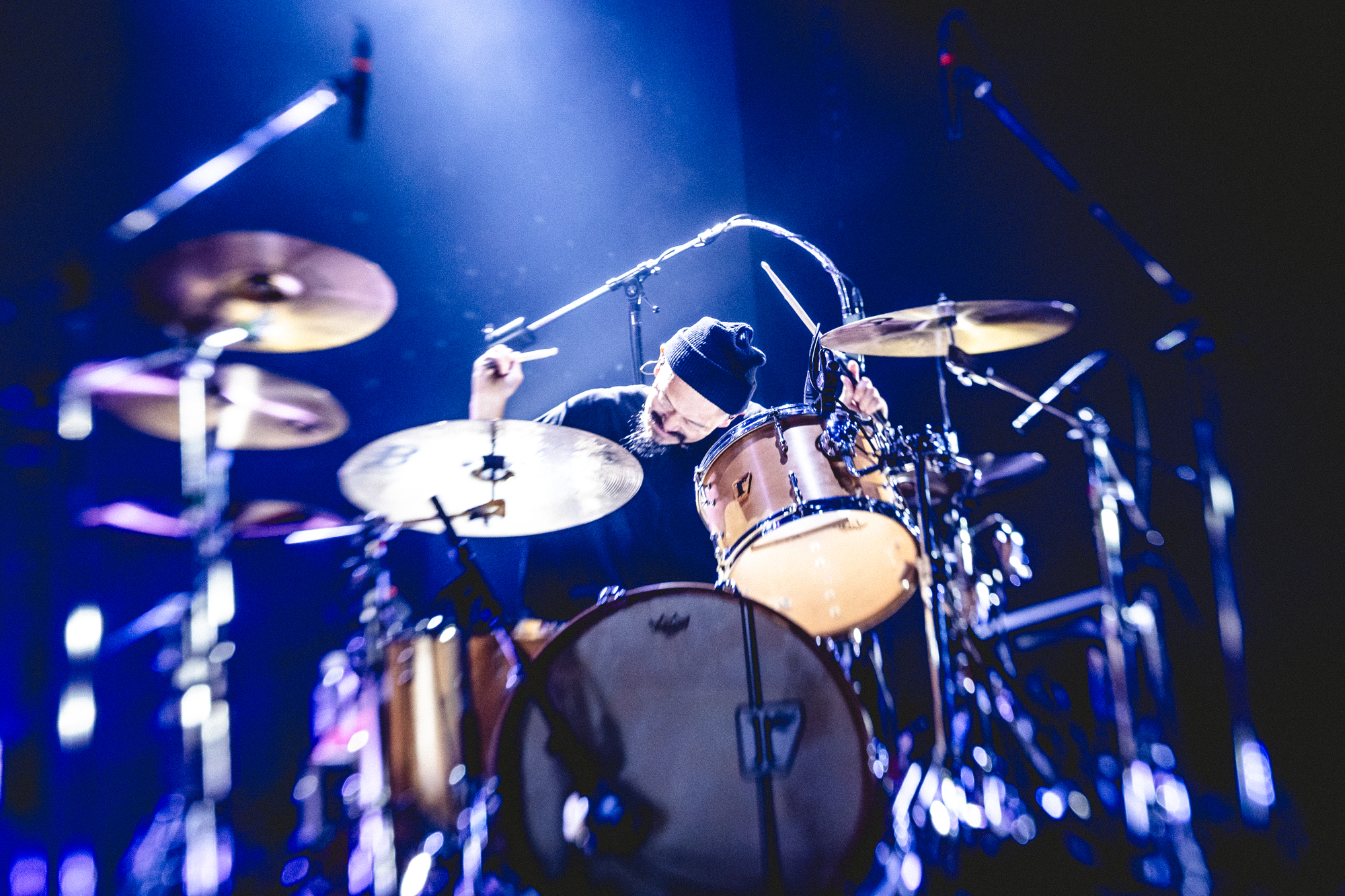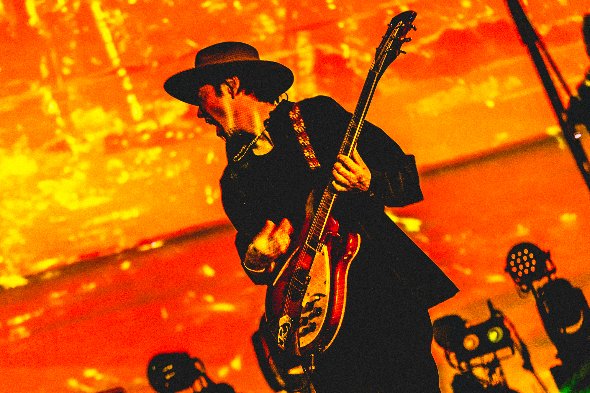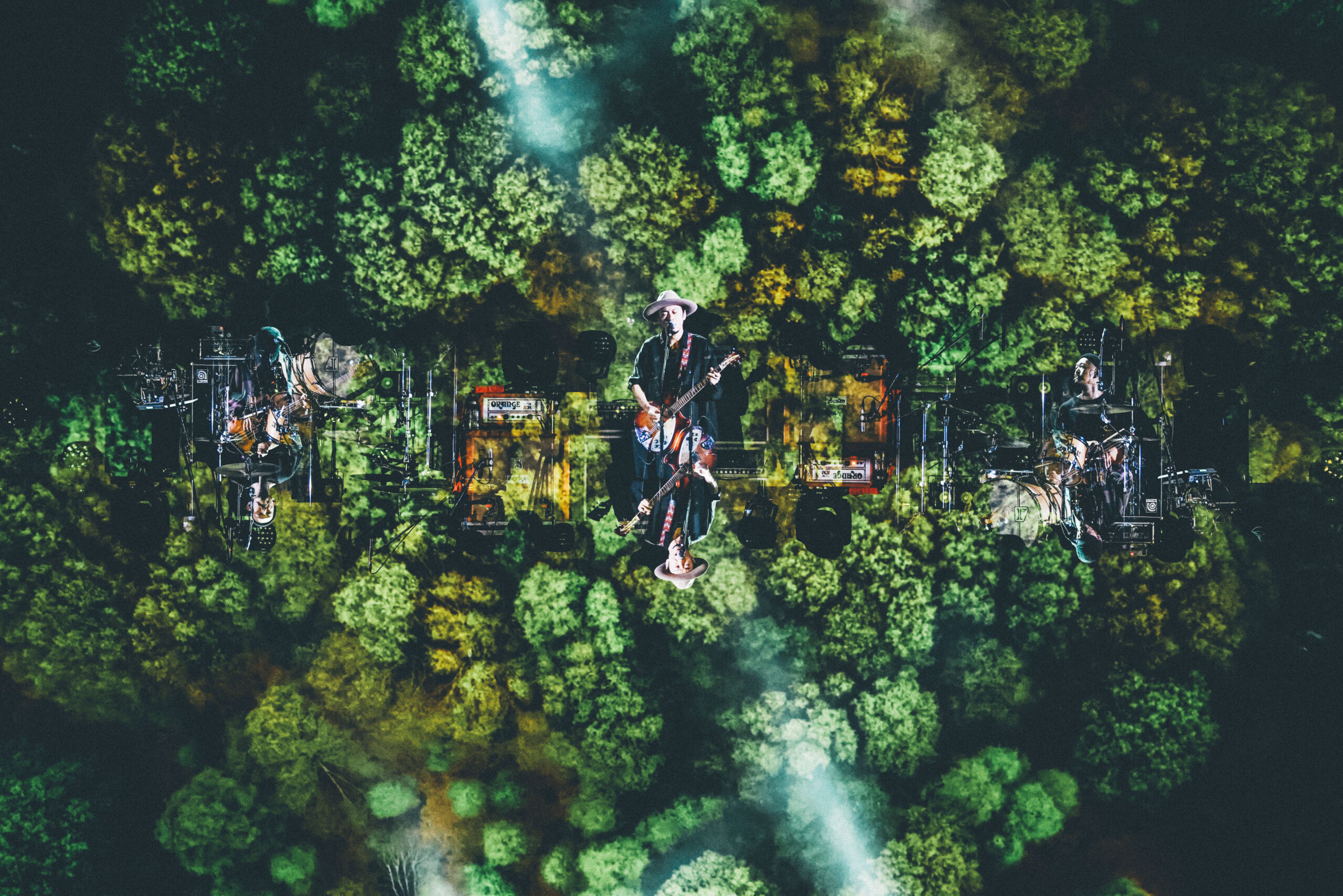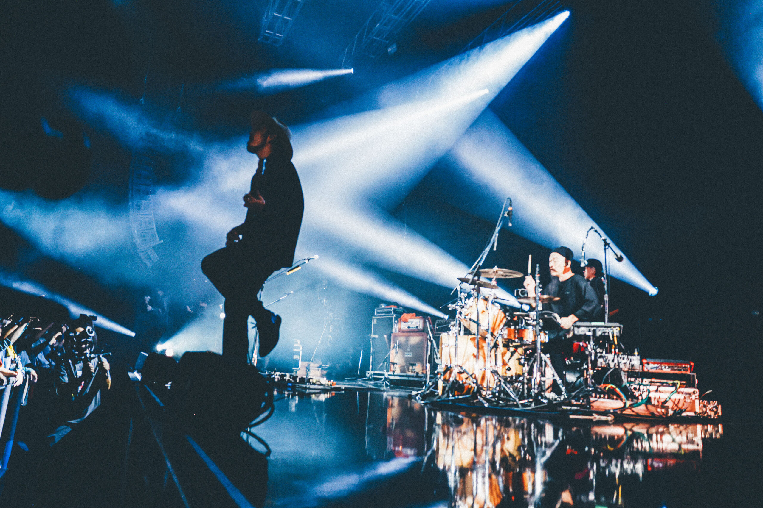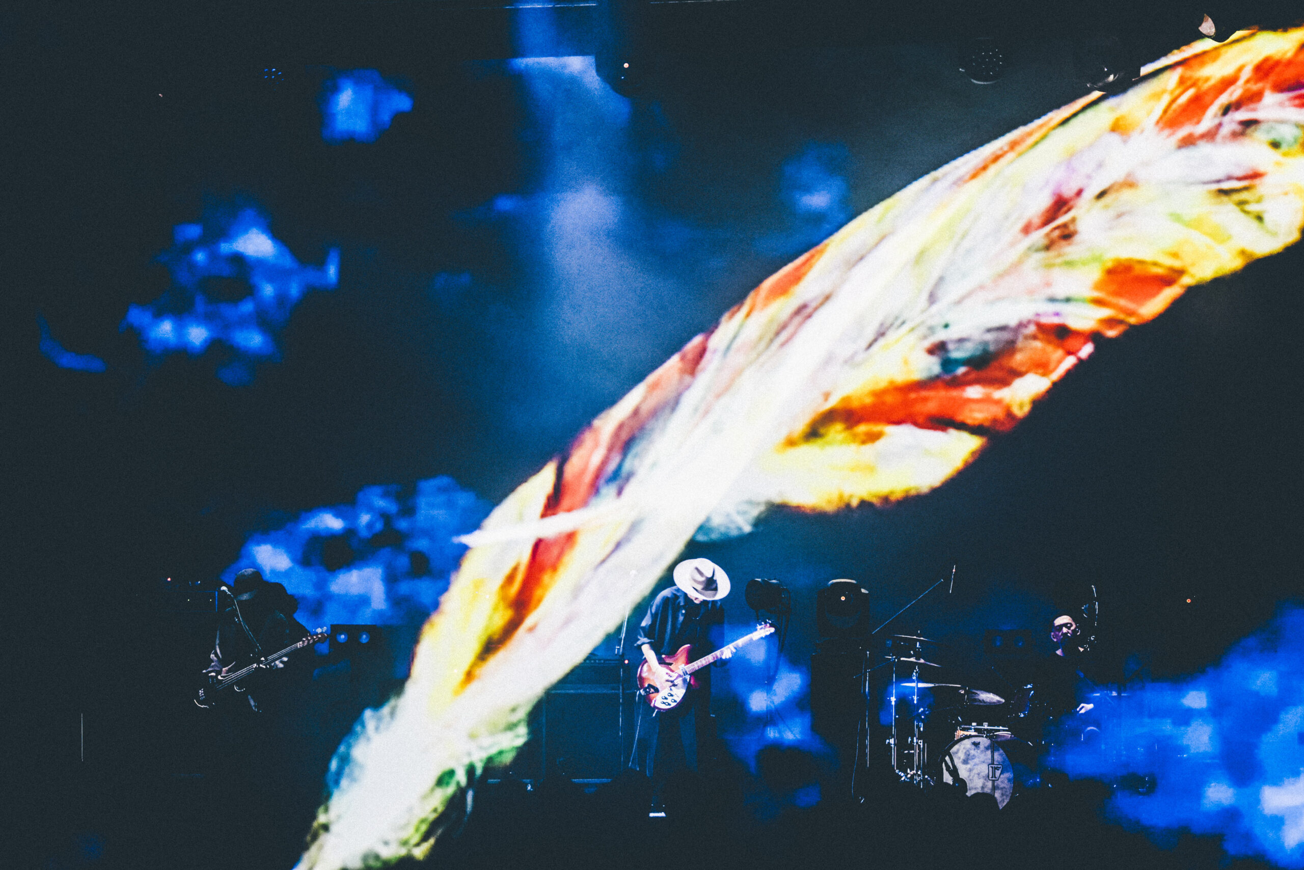 続いてのセクションは、「Rebirth」から「スロウレイン」へ、さらに「赤橙」から「リピート」へ。軽やかに踊れる曲から、メロディアスで劇的な曲調を連ねて、オーディエンスを大きく包み込む。「リピート」のアウトロ、3つの楽器が激しくぶつかり溶け合う展開は、まさに音の化学反応と呼ぶにふさわしい。クライマックスは、アコースティックギターの爪弾きが、息を呑む劇的なロックバラードへと展開する「季節の灯」と、一人でゆっくりと歩きだすようなリズムが、力強い行進へと進化する「アルケミスト」だ。まばゆく白い光がステージから溢れ出す。シンプルで強い演出が、壮大な楽曲によく映える。
